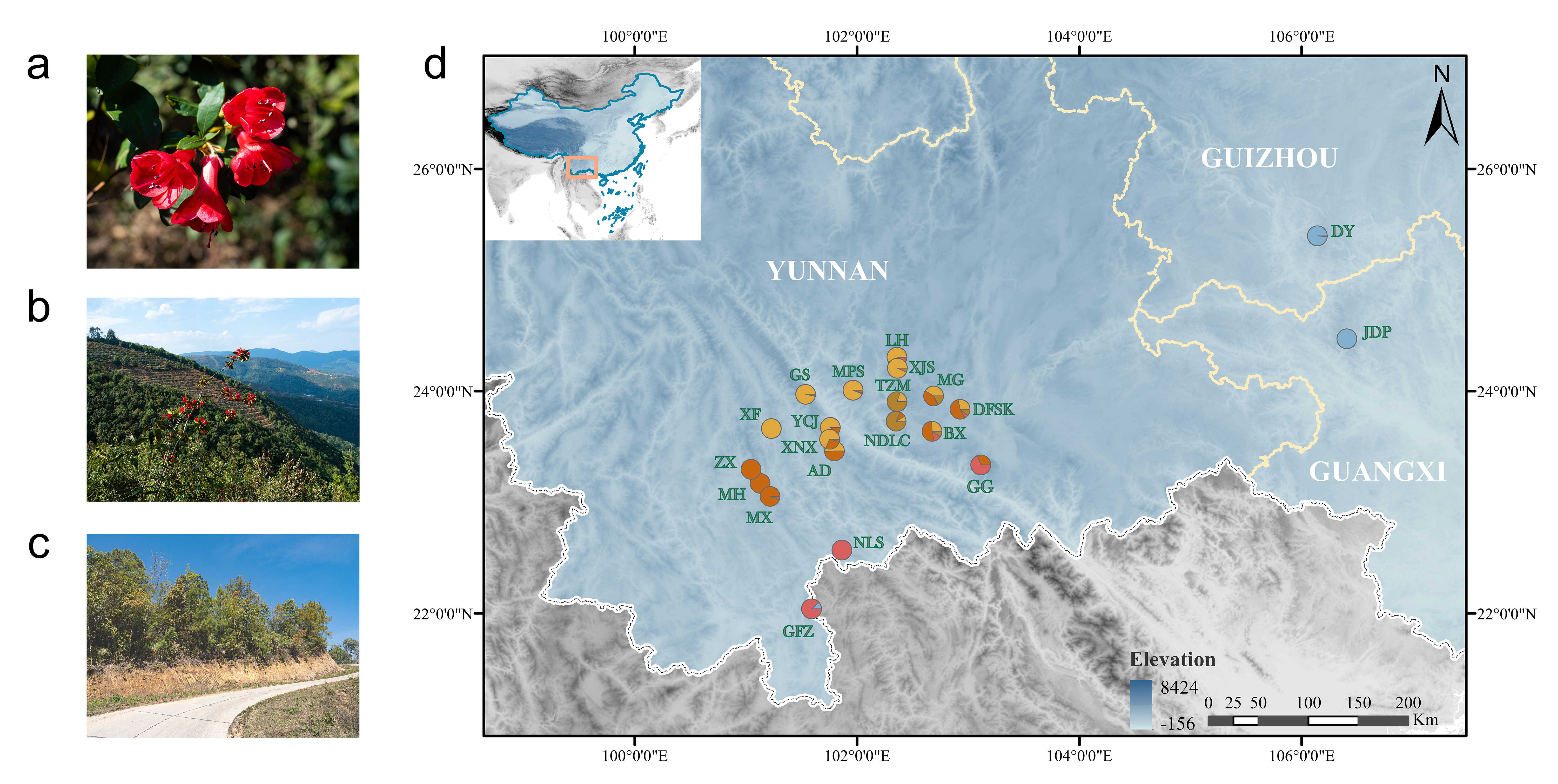 红马银花(Rhododendron vialii)隶属杜鹃花属马银花组,具有该组内特有的红色管状漏斗形花冠,且新叶为红色,具有极高观赏价值和育种潜力。森林砍伐、农业活动及非法采挖导致该物种栖息地破碎化严重,除个别种群外,大多数种群规模较小且成熟个体较少。因此被纳入《云南省极小种群野生植物拯救保护规划(2021–2030年)》和《云南省重点保护野生植物名录》(2023版)中进行优先研究保护。尽管如此,其种群现状和濒危机制仍不明确,难以有效支撑未来开展综合保护行动。