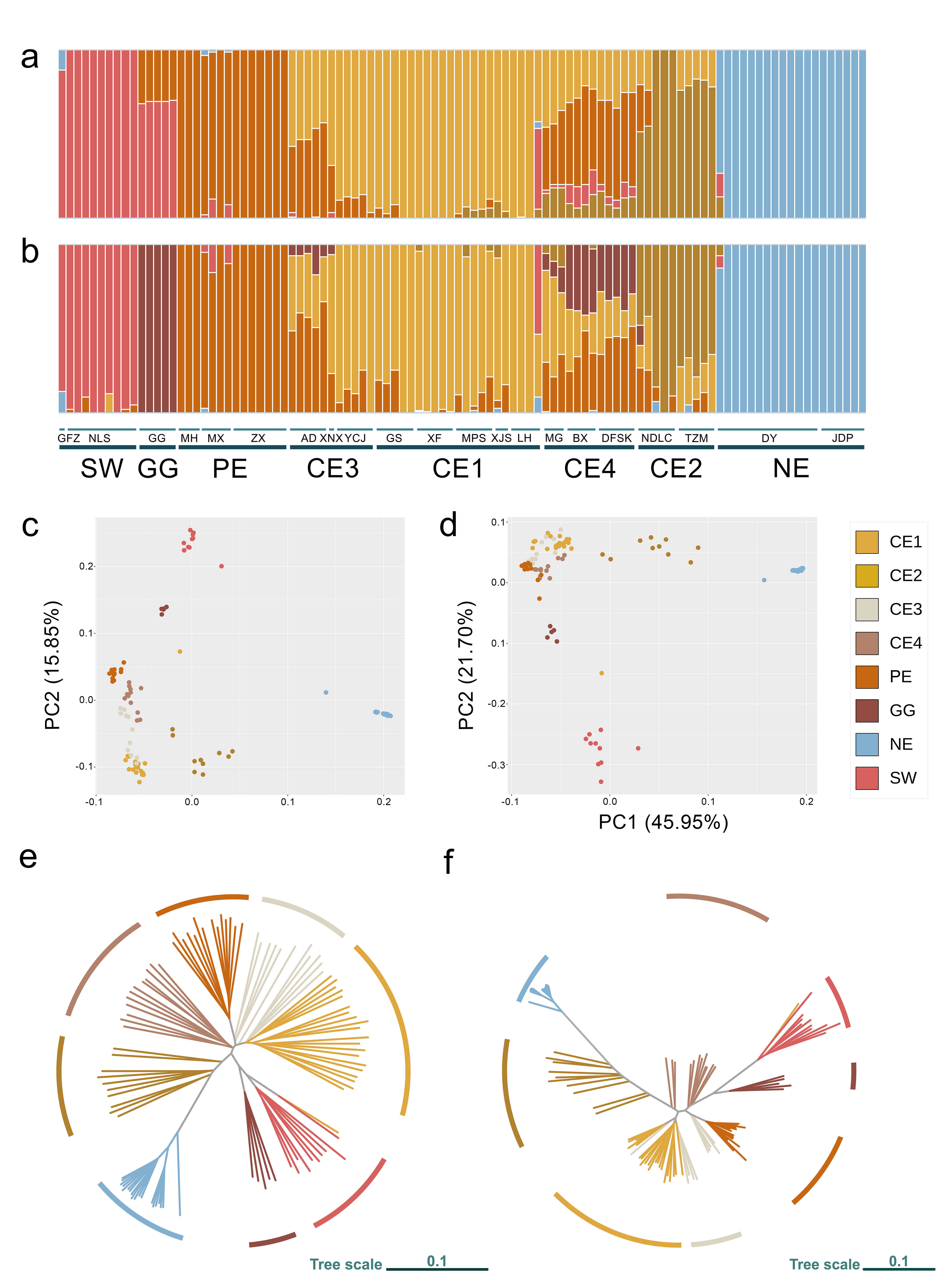 中国科学院昆明植物研究所极小种群野生植物综合保护团队基于前期发表的红马银花高质量单倍型基因组,进行了全面的调查采样。对其整个分布范围内的21个分布点、102个样品开展群体重测序研究。研究表明红马银花至少包含5个谱系。另外发现虽然龟谷种群基于非连锁数据集和中性数据集均显示为遗传混合背景,但适应性数据集则将其划分为单独的谱系。红马银花的群体间分化主要受地理隔离、地形和局域适应性驱动。对比同样使用全基因组重测序分析的极度濒危物种朱红大杜鹃(1.52e-2 vs. 1.94e-3),红马银花的遗传多样性并不低,暗示遗传多样性水平不是其受威胁的主要原因。第四纪气候震荡导致的反复遗传瓶颈可能是边缘种群规模较小的原因。普洱种群较小的种群规模可能与近交导致的有害突变积累有关,而中部种群规模收缩更可能与近期人类活动有关。未来气候快速变化将导致红马银花的潜在适宜生境剧烈收缩与破碎化,高海拔地区预计将保留更多适宜生境。不同种群面临不同的气候压力,特别是边缘种群基因组脆弱性更高。根据上述分析结果,研究认为应重点关注边缘种群(极小、隔离、独特的遗传背景,且未来存在较大灭绝风险),需要进行迁地保护为主以及构建保护小区为辅的就地保护。此外,龟谷种群应被视为适应性单元加强就地保护管理,以保存其独特的适应性。