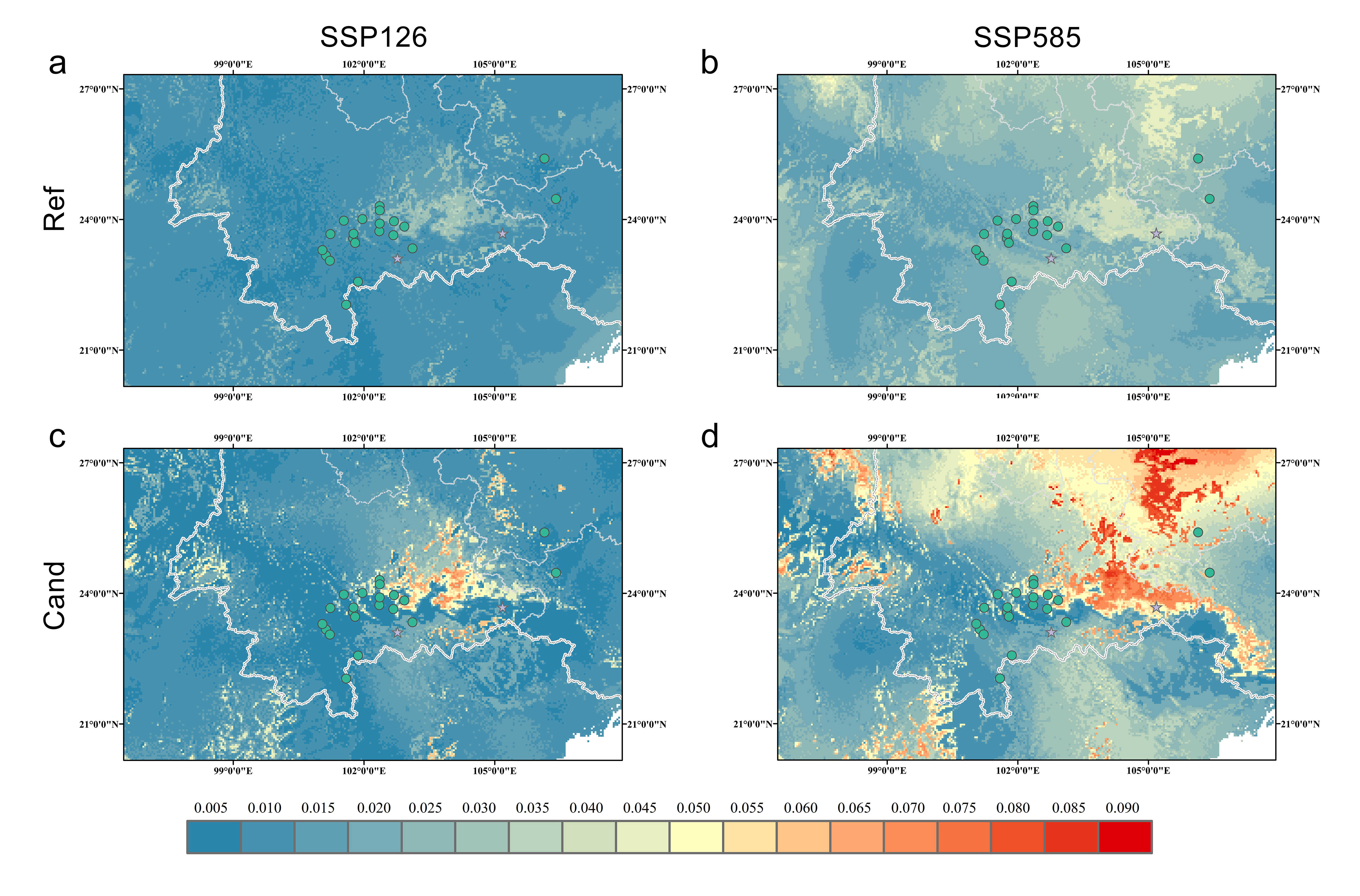 图3 基于所有SNP和环境适应性SNP预测的未来情景下红马银花的基因组脆弱性