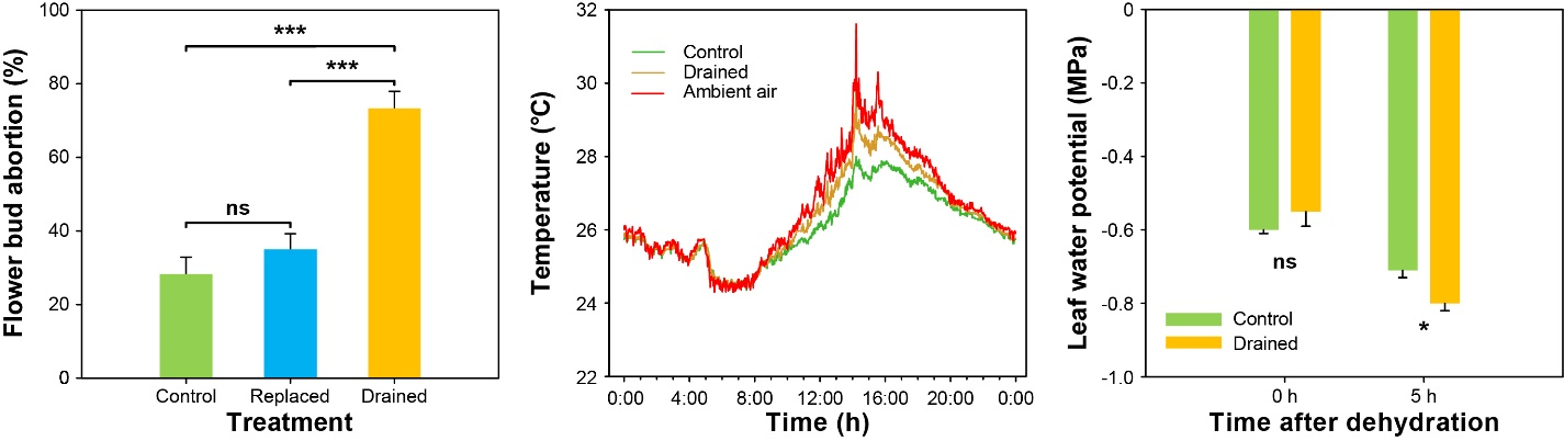 图2 大苞半蒴苣苔子宫状苞片内液体对花发育、温度和叶片耐旱能力的影响