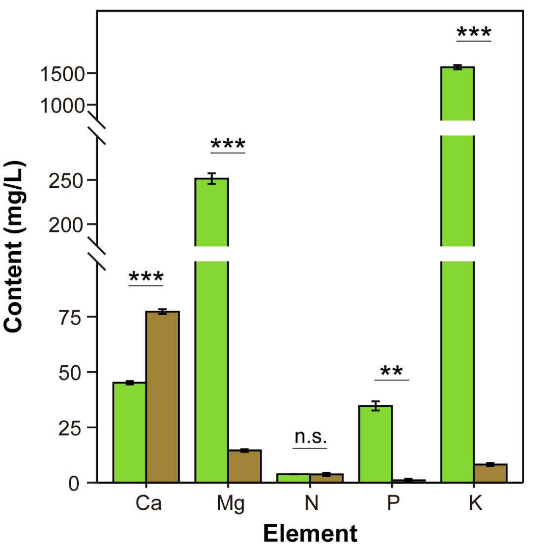图3 大苞半蒴苣苔子宫状苞片内液体与叶片液体的元素含量比较(绿色:叶片;棕色:苞片)