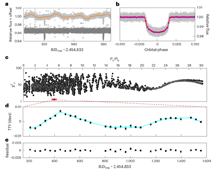 这颗新发现的非凌星行星围绕一颗G9V型宿主恒星Kepler-725运行,公转期间在一定时间内位于宿主恒星的宜居带内,其轨道周期为207.5天,轨道半长轴为0.674天文单位,接收的平均辐照为地球的1.4倍,具备生命存在的条件。该联合研究团队通过分析同一系统中周期为39.64天的类木行星Kepler-725b的TTV信号,成功反演出了这颗“隐匿行星”的轨道参数和质量信息(参见图2),印证了利用TTV技术发现类太阳恒星宜居带内低质量行星的可行性。这种方法无需行星轨道面与视线完全对齐,也无需测量宿主恒星的视向速度曲线,特别适合探测质量小、周期长、非凌星的宜居带行星。有效地弥补了当前凌星法和视向速度法的不足,为未来探测“地球2.0”提供了强有力的备选方案。在欧洲的PLATO卫星和中国的ET卫星发射运行后,该通道将有效助力发现“地球2.0”。