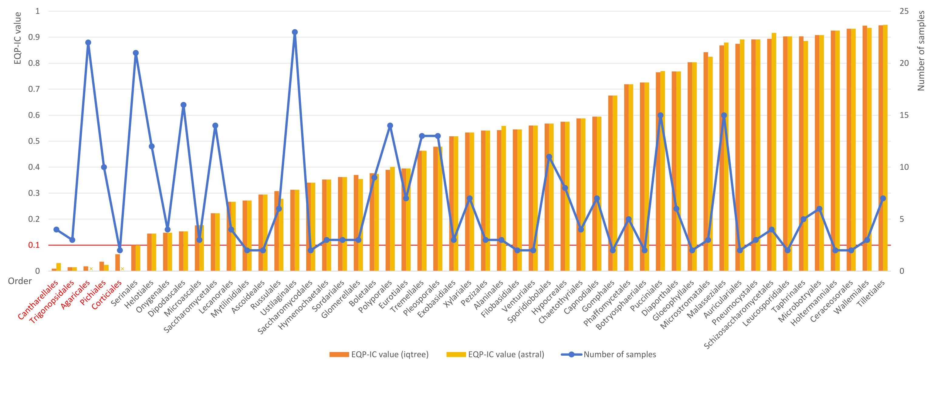 图1 子囊菌门和担子菌门下各目的EQP-IC值统计图。左边纵坐标为EQP-IC值,右边纵坐标为样品数目,横坐标为目拉丁名。