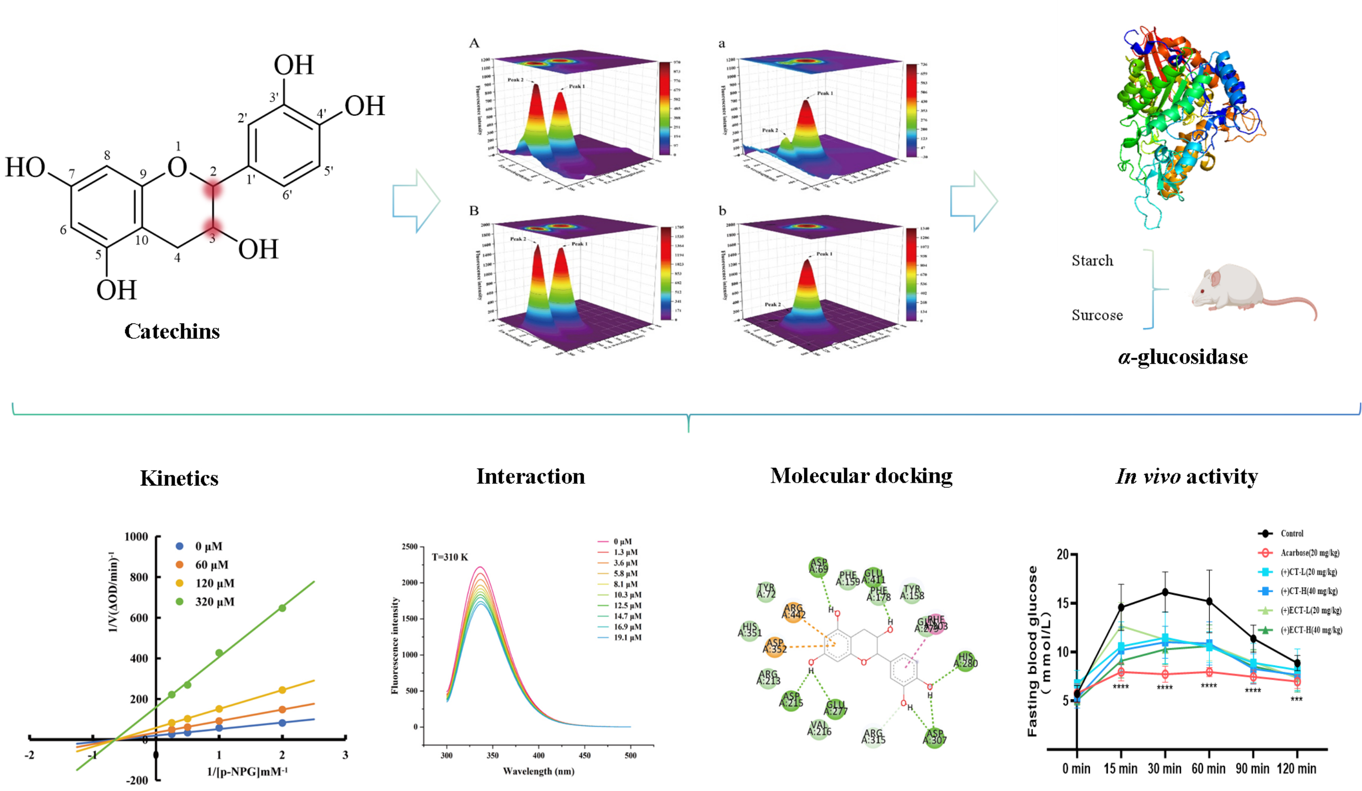 儿茶素是自然界广泛分布的黄烷醇类成分,存在于多种中药、饮料、水果、蔬菜等食药植物中,具有抗氧化、抗炎、抗肿瘤、降糖、心血管保护等多种功效。研究团队利用多种体外模型,对天然存在的四种儿茶素异构体进行了系统的降糖活性筛选,发现该类成分对α-葡萄糖苷酶具有明显的抑制活性,特别是(+)-CT和(+)-ECT的IC50分别为63.5 μM和73.8 μM,体外活性优于降糖药物阿卡波糖。进一步利用酶动力学、多谱学(荧光、UV、CD等)和分子对接等手段揭示了不同儿茶素异构体与α-葡萄糖苷酶的结合方式及抑制机制,其中(+) ECT为α-葡萄糖苷酶的混合型抑制剂,同时作用于游离酶和酶-底物复合物,主要通过静电作用影响酶的疏水区域,与α-葡萄糖苷酶的结合能显著低于阿卡波糖,与体外测试结果一致。最后利用小鼠口服淀粉和蔗糖耐受试验,验证了其体内降糖功效。该工作系统揭示了不同儿茶素异构体抑制α-葡萄糖苷酶的活性和机制差异,为儿茶素类产品的开发利用提供了依据。