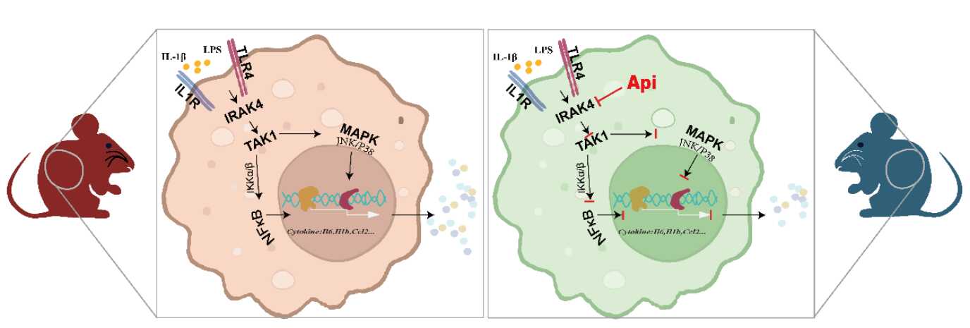 芹菜素(Api)是一种天然黄酮类化合物,广泛存在于多种食药植物中,在健康科学领域备受关注。芹菜素具有显著的抗氧化和抗炎活性,通过抑制NF-κB以及MAPK信号通路减轻炎症反应,然而调节这些信号通路的确切机制尚不清楚。白细胞介素-1受体相关激酶4(IRAK4)是TLR和IL-1R信号通路的核心组分,兼具激酶和Myddosome复合体支架功能。IRAK4的过度激活与慢性炎症密切相关,是多种疾病药物治疗的潜在靶点,然而天然来源的IRAK4抑制剂报道较少。中国科学院昆明植物研究所耿长安团队联合上海药物研究所李佳团队等首次发现Api是IRAK4的天然小分子抑制剂(IC50 = 1.74 μM),可直接与IRAK4结合(Kd = 4.78 μM),并以IRAK4依赖的方式抑制NF-κB、MAPK信号通路,在转录组水平降低巨噬细胞免疫反应,进一步利用小鼠急性炎症和UC模型验证了其体内抗炎药效和分子机制。本研究为新型IRAK4抑制剂的发现和芹菜素的开发利用提供了理论依据。
