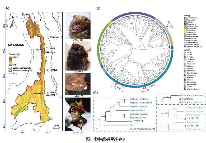 2022年至2024年,中国科学院昆明动物研究所刘振团队在对怒江州、保山市和德宏州境内的高黎贡片区进行多次蝙蝠多样性考察中,发现了4种未曾记录的蝙蝠物种,经过形态学和分子系统生物学研究,证实采集到的样本为蝙蝠新物种,分别鉴定为:圆耳菊头蝠(Rhinolophus yuaner)、金毛伏翼(Arielulus jinmao)、毛脚管鼻蝠(Murina maojiao)和短脚管鼻蝠(Murina duanjiao)。本研究发现将高黎贡地区记录到的蝙蝠物种总数增加到51种,表明该地区的蝙蝠多样性可能被低估。此外,通过整合发现的4种蝙蝠新物种与现有的文献资料,我们编制了一份最新的中国蝙蝠名录,包括8科38属167种。这些发现和相关数据为进一步研究区域生物多样性奠定重要基础。