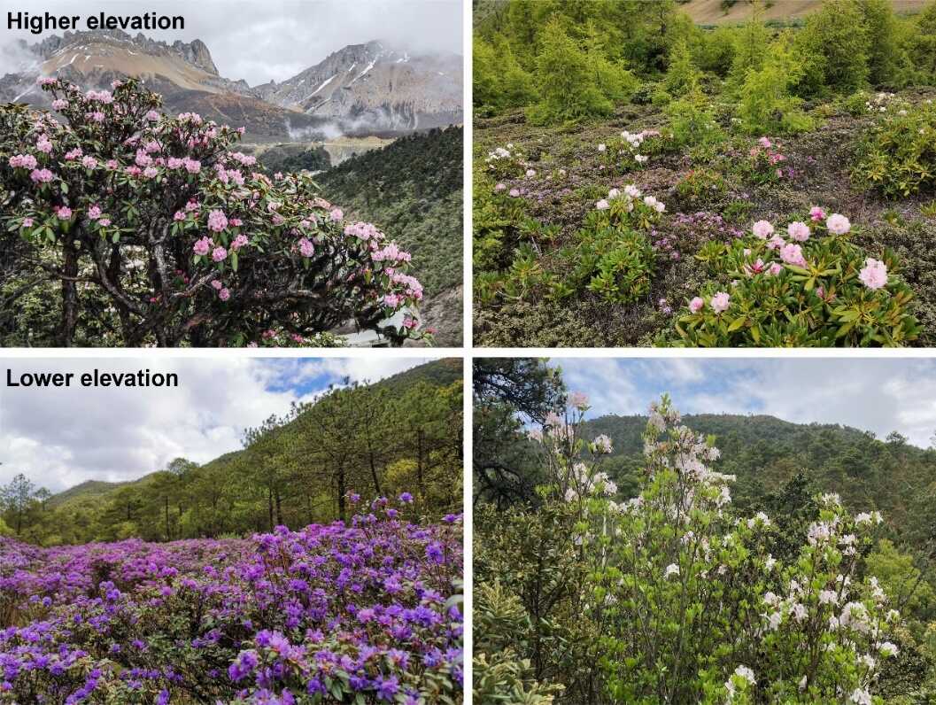 对于植物而言,关于“繁殖”与“生长”,“花朵”与“叶片”孰轻孰重的问题一直众说纷纭。近期,中国科学院昆明植物研究所孙航院士研究团队联合高山植物功能生态学知名学者、瑞士巴塞尔大学Christian Körner教授研究团队,对横断山区高(高山树线交错区)、低(中山森林带)海拔生境内(图1)的杜鹃花优势种类的花、叶抗冻性以及种间和种内开花、展叶物候时序进行了探索,以期从适应进化的角度为这一谜题提供些许线索。