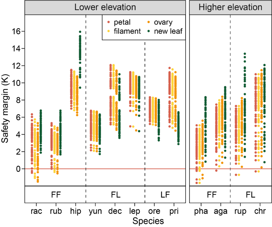 研究发现高、低海拔生境内杜鹃种类的新生叶片在百年时间尺度上发生低温冻害的可能性为零[抵御冻害安全阈值(Safety margin)> 0];相反,高、低海拔生境内的早花杜鹃种类的繁殖器官(花朵)则面临明显的低温冻害威胁(有部分年份Safety margin < 0)(图2)。更加有趣的是,研究发现高海拔生境内相对“安全”的新生叶片并非完全得益于其更强的抗冻性,其中部分种类的抗冻性甚至与低海拔种类接近[如栎叶杜鹃(Rhododendron phaeochrysum)新叶抗冻性仅为-4.0°C],其主要依靠精准的展叶物候发生时间控制,将新生叶片置于低温发生频率和强度较低的夏至日前后,以“躲避”低温冻害威胁。然而,高、低海拔生境内的早花种类[如多色杜鹃(R. rupicola);腋花杜鹃(R. racemosum)]则不约而同地选择了“先花后叶”的物候策略,保证敏感新叶免受低温冻害之苦,却让花朵扮演了更多的“机会主义者”角色,在获得更多资源(例如传粉者)的同时,也承载了更多的冻害损伤甚至损失的风险。幸运的是,研究开展期间,研究者观察到低海拔早花种类腋花杜鹃(R. racemosum)和红棕杜鹃(R. rubiginosum)花朵受到生长季节早期低温冻害损伤,结合植物原生地实测低温与实验室检测获得物种花朵抗冻性数据的比较,也同时验证了抗冻性检测的准确性与可靠性。所以,对于山地多年生木本植物而言,在“繁殖”和“生长”之间的天平可能倒向后者,尤其是对于叶片寿命仅有2年的常绿杜鹃类群而言,1年甚至多年无子无嗣的结果尚可承受,而叶片一旦损失则可能面临生存的巨大挑战。