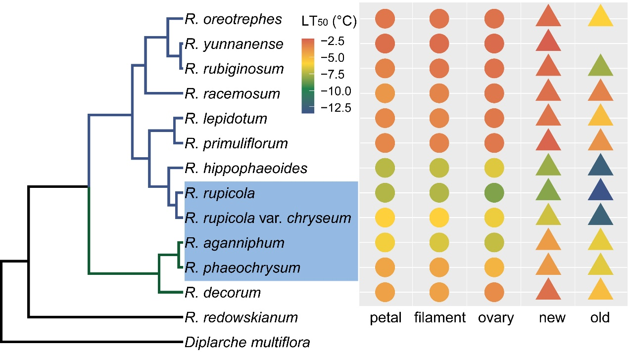 该研究联合植物原生地气候特点与历史低温极值和海拔梯度,首次探讨了横断山杜鹃花属植物繁殖和营养器官抗冻性与花、叶物候间的进化关系以及物种的适应策略,其中关于抗冻性具有系统发育保守性的观点(图4)也为今后该区域相关研究的开展奠定了基础。