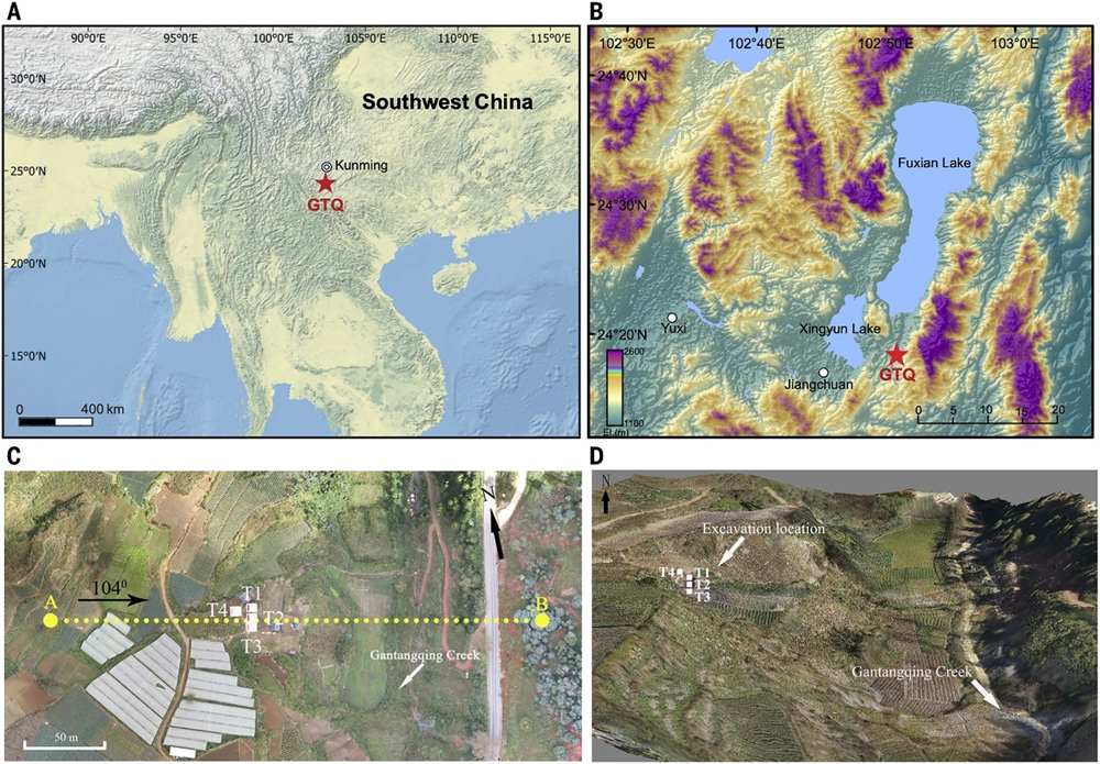 图1.甘棠箐遗址(GTQ)位置。(A)东南亚区域地图,显示了遗址及云南省会城市昆明市的位置。(B)数字高程地图,标示了甘棠箐遗址、抚仙湖、玉溪市和江川区以及周边地区。(C)遗址区域航拍图,展示了遗址周边及发掘探方(T1 ~T4)的位置。此图中的 A — B 线对应于图 2A 中的沉积剖面。(D)三维(3D)模型展示了遗址的地形地貌以及 T1 ~T4 探方的位置。