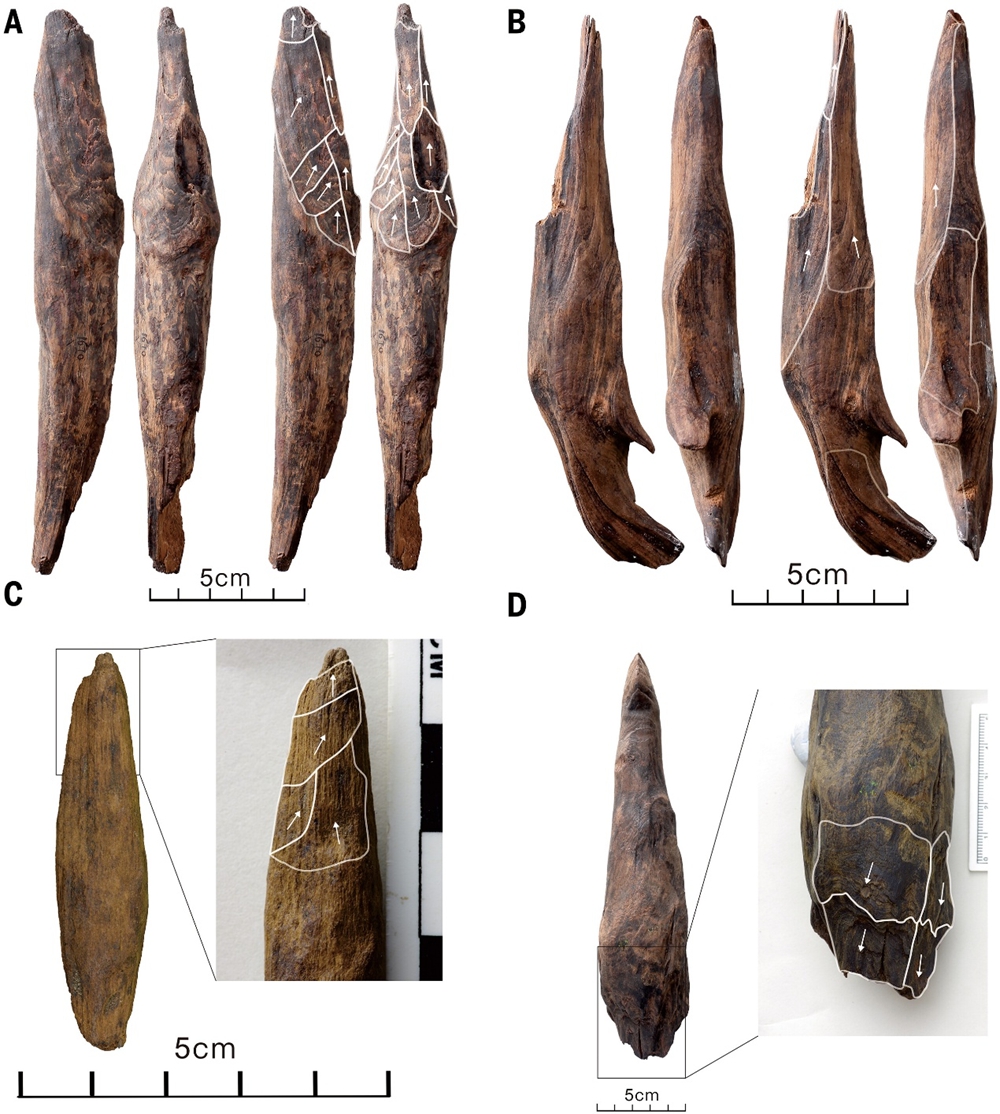 图2.木器加工示意图。(A)T2 - 1670。(B)T1 - 1898。(C)T4 - 193。(D)T2 - 1674。箭头指示修削方向;白线圈出的位置为修削疤痕,因使用磨损或保存不佳导致边界不太清晰。