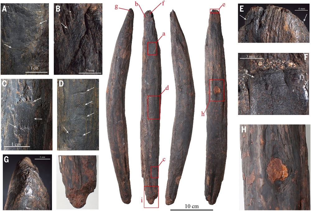遗址共出土近千件木质材料,通过工具形态、加工及使用痕迹等的观察分析,并与针对性模拟考古实验结果进行对比研究,35件木质遗存最终被确定为人工加工工具。这些木制工具大小不一,形态多样,其尖部形态可分为凿尖状、铲尖状、锥尖状、钩状和凸缘状等。其中19件标本保留明显的削枝修型和加工使用端尖部留下的修削痕(图2),17件尖端保存有因使用而产生的磨光、条纹、纤维折断和木质破损等痕迹(图3),这些加工和使用痕迹出现在特定部位并具有方向性,且部分标本尖部和器身还保存有冲填土壤和植物残留物,是甘棠箐古人类加工与使用木器的确凿证据。木器中有两件需双手持握的大型挖掘棒(digging stick;图3),其形态与意大利Poggetti Vecchi遗址(约17.1万年前)的出土标本相似。另有四件型制独特钩状工具,可能用于切断植物根系;其余的标本则为可单手持握的小型挖掘工具。相较于旧大陆西部遗址出土的大型木器(以狩猎工具为主),甘棠箐的木质工具种类更丰富,尤以小型单手持握的木器为主,反映了生活在此地的古人类在木材选择、功能性刃部预制方面具有前瞻性和计划性,能根据不同的功能需求制作不同形态的工具。研究还揭示了在与欧洲和非洲不同的环境背景下,东亚古人类所具有独特的适应策略和生存方式。生活在甘棠箐的古人类在亚热带环境中以植物资源为重要食物对象,而在欧洲舍宁根等北温带环境中,对大型哺乳动物的狩猎则明显占据了主导地位。甘棠箐的木器组合显示了有机材料作为旧石器时代加工人工制品的重要性,它们的制造技术与东亚和东南亚发现的石器明显的“原始”性质形成了鲜明的对比,木制工具可能在东亚中更新世古人类的生存和环境适应中发挥了重要作用。