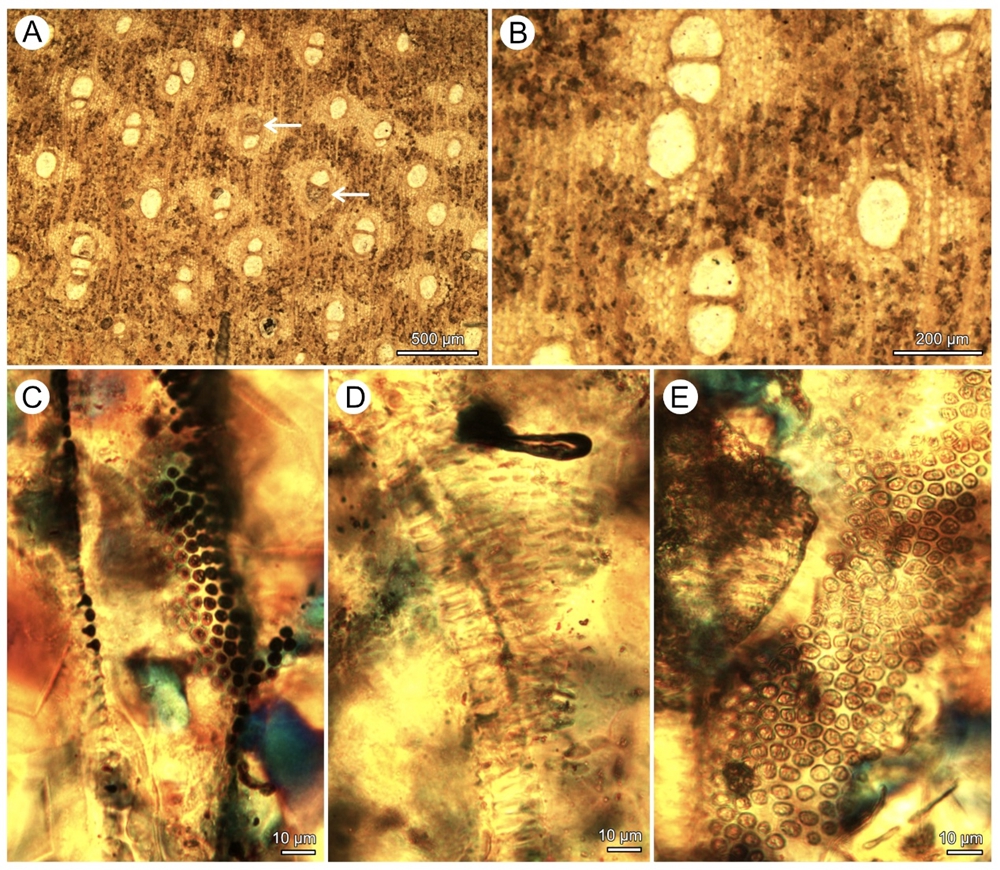 图 1. 榄仁型木 Terminalioxylon sp. (cf. T. eo-olivari) 的木材解剖结构,示横切面(A-B)和弦切面(C-E)。