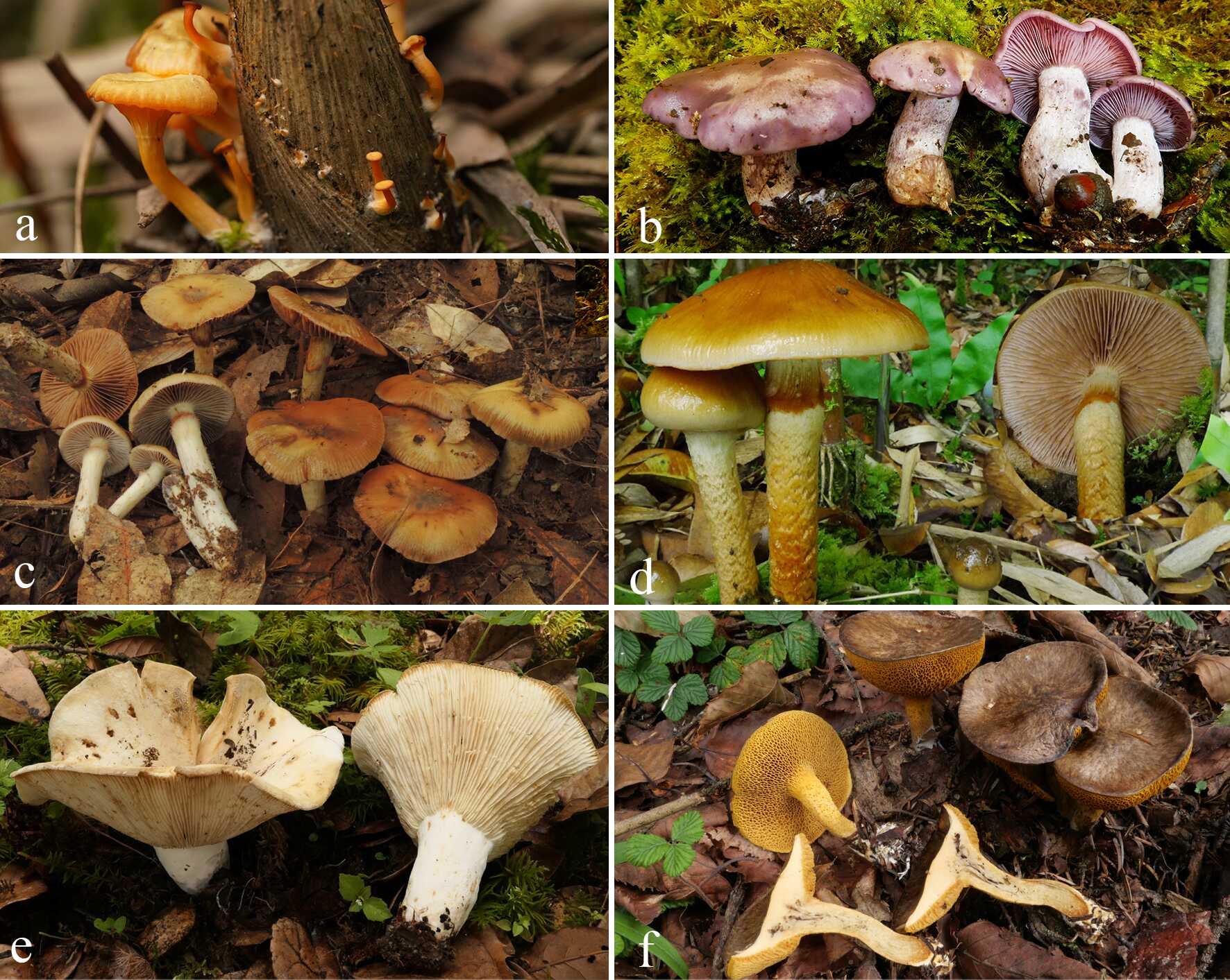 图2 研究描述的分布广野外频见但一直未被命名的新物种:a 云南脐盖菇 Chrysomphalina yunnanensis;b 新裸金钱菌 Collybia neonuda;c 平展丝膜菌 Cortinarius applanatus;d 斑柄丝膜菌 Cortinarius zebrinus;e 中华绒白多汁乳菇Lactifluus sinovellereus;f 美丽乳牛肝菌Suillus splendens.
