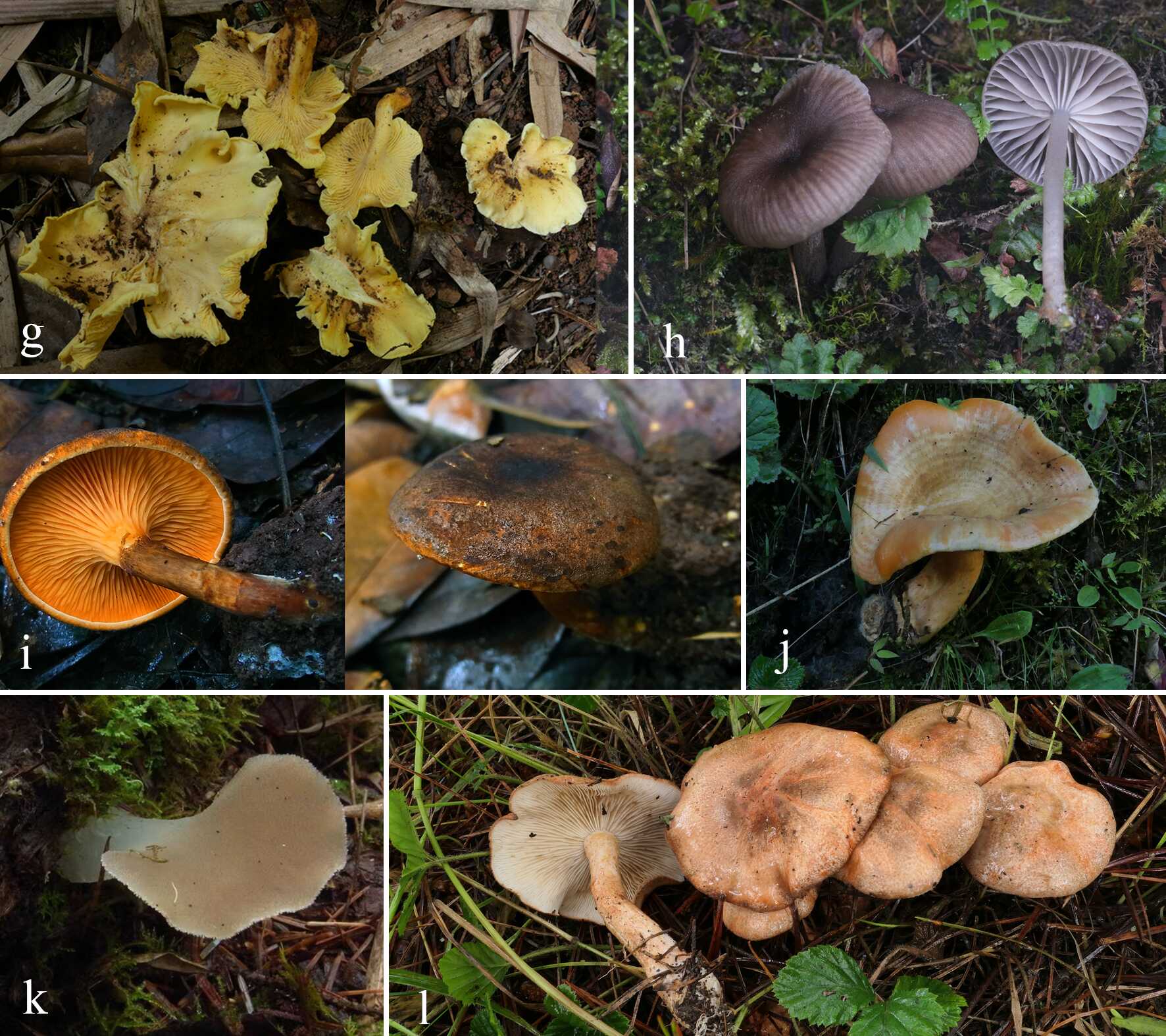 图3 研究发现的分布区狭窄的稀有新物种:g 多瓣鸡油菌 Cantharellus multilobatus;h 西藏小杯伞 Clitocybula xizangensis;i 高黎贡拟蜡伞 Hygrophoropsis gaoligongensis;j 孤独乳菇 Lactarius solitarius;k 落叶松假齿菌 Pseudohydnum laricicola; l 芳香毛离褶伞 Tricholyophyllum fragrans.