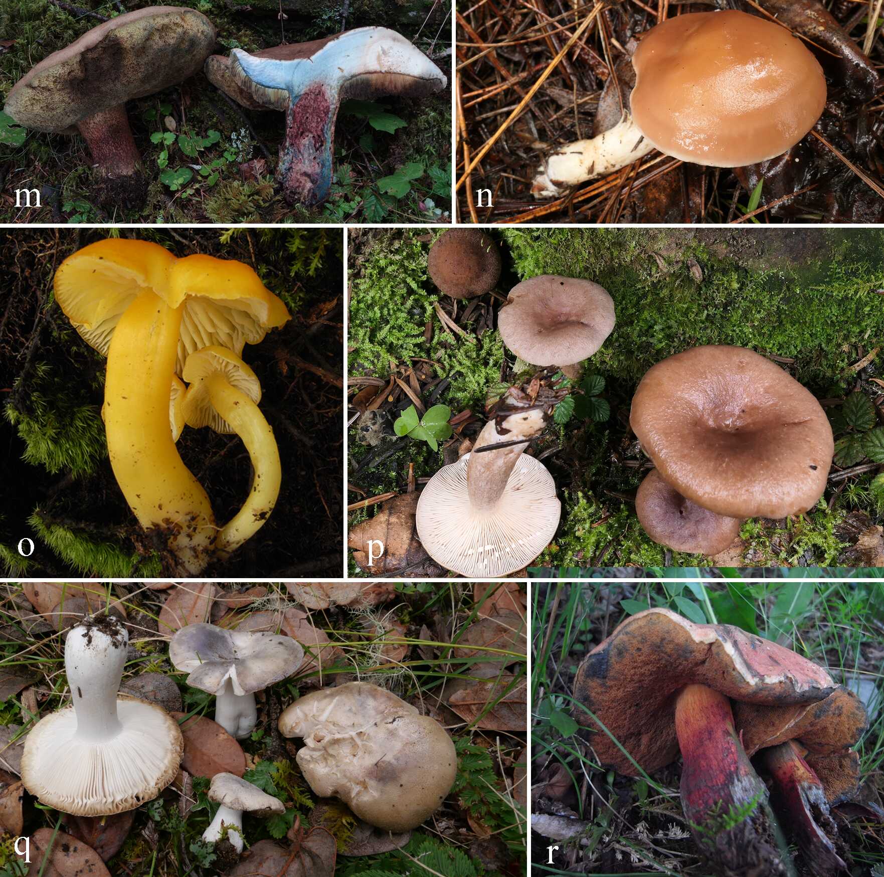 图4 青藏高原区发现的与北温带共享或近缘的物种:m 针叶美柄牛肝菌 Caloboletus conifericola;n 叶生格氏伞 Gerhardtia foliicola;o 坛孢湿伞 Hygrocybe urniformis;p 中华凋萎状乳菇 Lactarius sinovietus;q 糙盖红菇 Russula scabrella;r 甘肃赭黄牛肝菌 Suillellus gansuensis.