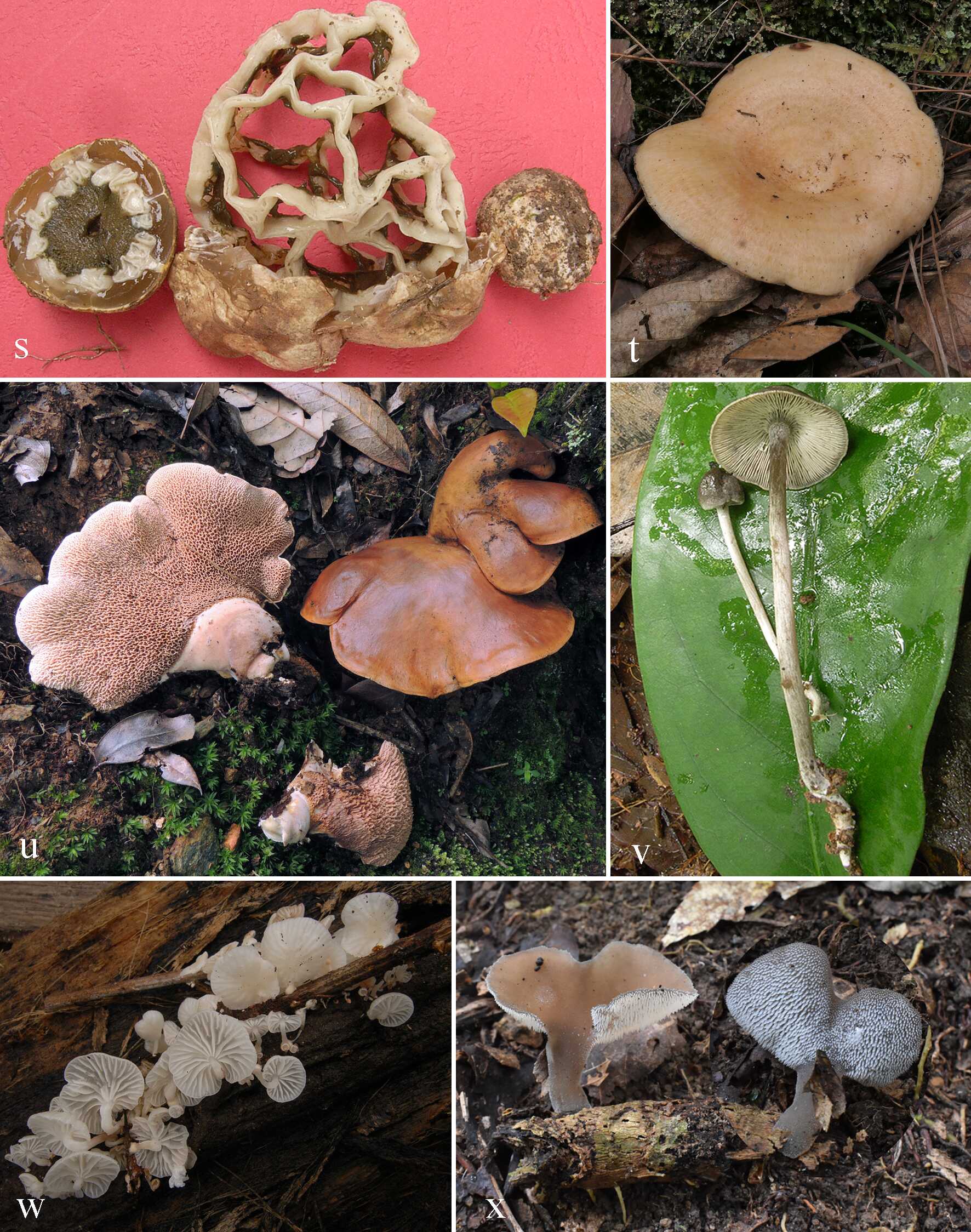 图5 青藏高原及周边山地中低海拔带发现的具热带亲缘和“长枝长”的物种. s 粗臂网球菌Ileodictyon robustius;t 辣汁乳菇 Lactarius acrigalus;u 大孢尿囊菌 Meiorganum macrosporum;v 黑肉伞 Nigrocarnea radicata;w 棕榈拟小皮伞 Paramarasmius palmivorus;x 南方假齿菌 Pseudohydnum meridianum.