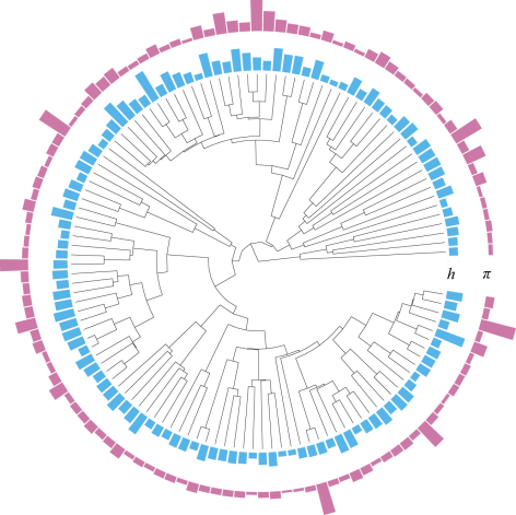 图1.喜马拉雅-横断山区120种鸣禽的全基因组核苷酸多样性(π)与杂合度(h)。各物种间的观测变异幅度达16.4倍(π)与6.5倍(h)