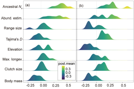 图2. 喜马拉雅-横断山区120种受测鸣禽基因组多样性的影响因素及其效应。 (a) 全基因组核苷酸多样性与 (b) 杂合度对潜在解释变量的回归系数估计值分布。变量包括:祖先有效种群大小(Ancestral Ne)、种群丰度估计值(Abund.estim.)、分布范围大小(Range size)、近期种群动态(Tajima's D)、海拔(Elevation)以及生活史特征(最大寿命Max. longev.、窝卵数Clutch size和体重Body mass)。