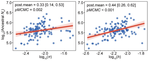 图3. 120种鸣禽长期有效种群大小(Ne)与遗传多样性之间的关系。 取对数后的祖先Ne与取对数后的全基因组核苷酸多样性(π)及杂合度(h)均呈显著相关。所有系数的后验均值及其统计显著性均通过贝叶斯系统发育广义线性混合模型计算得出;红色直线表示模型拟合结果,粉色阴影区域为95%置信区间。