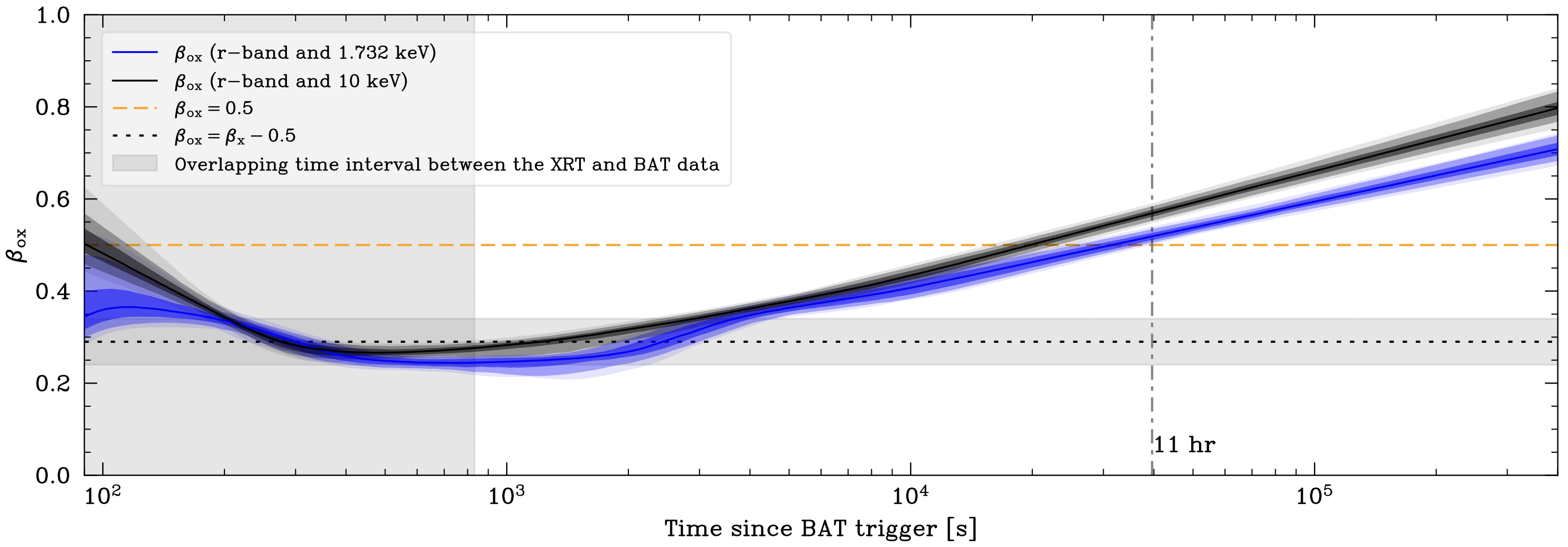 云南天文台研究人员利用包括丽江 2.4 米望远镜在内的空间和地面望远镜对 GRB 240825A 的余辉进行了及时观测,并结合多波段余辉数据对其光学暗度(optical darkness)进行了系统分析(图1)。研究采用光学到 X 射线波段的谱指数(βₒₓ)来量化光学暗度。研究表明,该伽马射线暴余辉的光学暗度随时间呈现出先减小后上升的演化趋势:在爆发后约 1000 秒时达到最小值,满足光学暗伽马射线暴的判据;而在爆发后约 11 小时,其光学暗度已不再符合光学暗伽马射线暴的定义标准,表现出明显的“由暗转亮”现象(图2)。