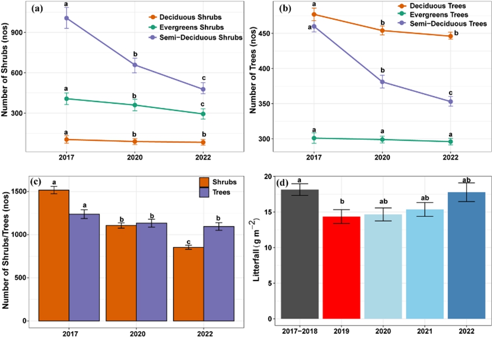 图2 2017年、2020年和2022年研究区半落叶、落叶和常绿灌木(A)和乔木(B)的数量,灌木和乔木数量(C),干旱前(2017-2018年)、干旱(2019年)和干旱后(2020-2022年)每月凋落物量(D)。不同的字母表示不同年份乔木或灌木的数量和凋落物的数量有显著差异(p < 0.05)。