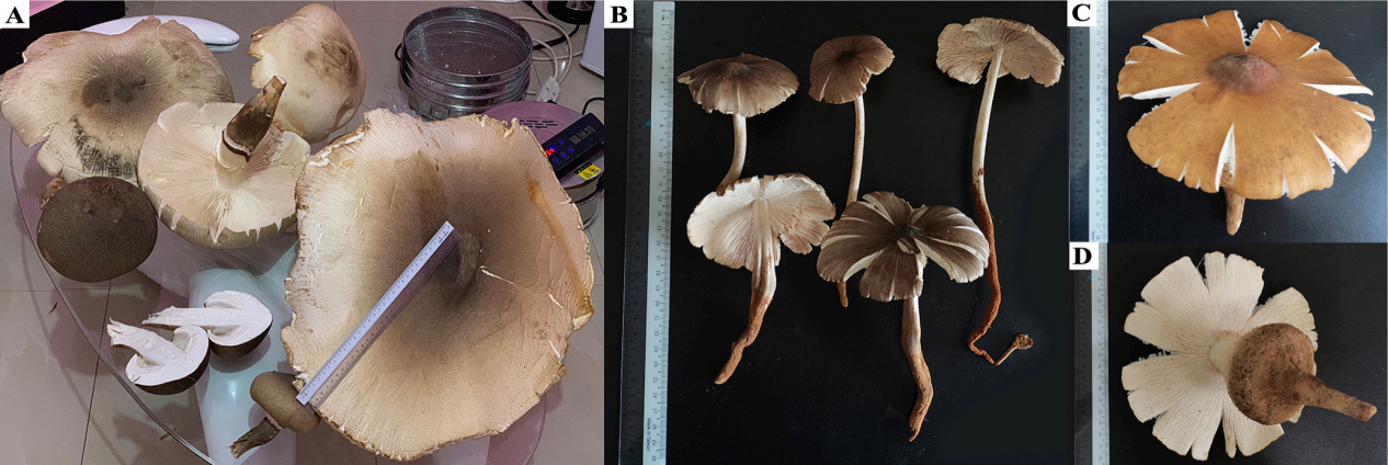 图1 蚁巢伞真菌:(A) T. titanicus;(B) T. intermedius;(C-D) T. bulborhizus