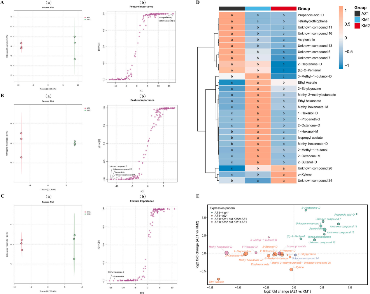 图2 差异挥发性化合物的鉴定与比较(A-D)以及表达模式(E)