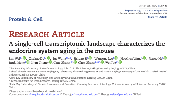 近期,北京大学生命科学学院陶伟教授团队、首都医科大学张晨教授团队和中国科学院昆明动物研究所张超研究员团队,构建了内分泌系统衰老图谱,系统解析了衰老的分子机制,为理解机体衰老及开发潜在抗衰老干预手段提供了新的科学依据,相关成果以A single-cell transcriptomic landscape characterizes the endocrine system aging in the mouse发表于 Protein & Cell 。