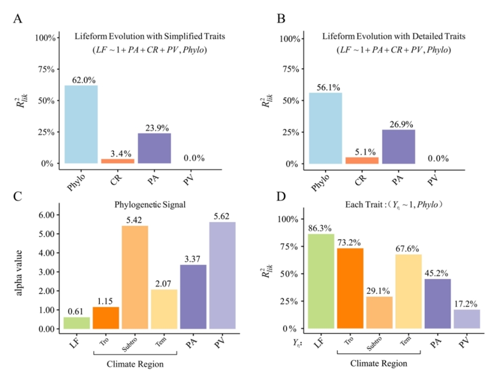 结果发现:常规相关分析的结果支持兰科生活型与气候分布区存在紧密关系,而生活型特征与传粉特征的相关性不明显。然而,基于partialR²推算的方法几乎得到相反的结论:物种演化历史是决定兰花植物生活型变异的最主要关键因素,其独立解释了62.0%的生活型变异量。传粉者吸引策略进一步独立解释了23.9%的生活型变异量;而气候分布区特征仅能独立解释3.4%的生活型变异量。兰科植物不同性状自身的进化保守性应该是造成常规相关结果认识偏差的形成原因。兰科植物生活型具有极高的进化保守性,气候分布区特征(热带、温带分布与否)的进化保守性亦较高,而两个传粉相关特征的进化保守性大幅减弱。