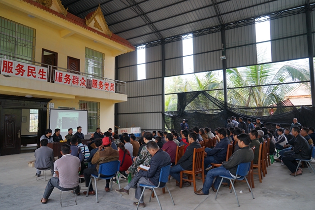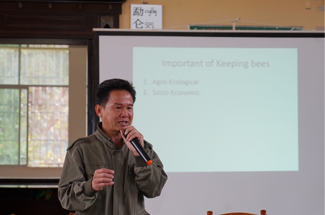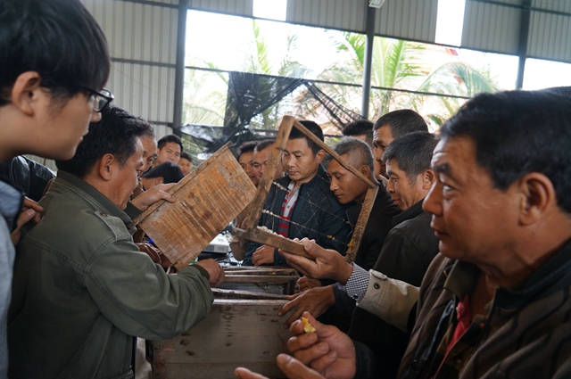 此次培训的技术人员之一 Souvick Chanthayod 是版纳植物园主任陈进研究员指导的老挝籍硕士研究生,也是老挝农业局技术骨干,有着丰富的野生蜜蜂养殖经验和技术。他介绍了野生蜜蜂养殖的益处、老挝野生蜜蜂养殖的情况,对野生蜜蜂的种类、分布、习性、繁殖,以及如何从野外引蜂、蜂箱的制作和蜂蜜的收割技术等作了详细地讲解。养蜂户对培训内容很感兴趣,遇到不懂的问题就踊跃提问,学习热情很高,现场气氛热烈。