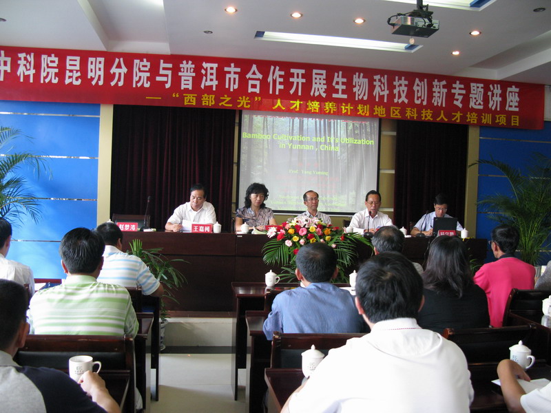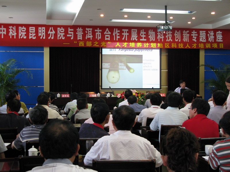 为帮助普洱市加快重点产业技术创新步伐,促进院所科技资源,人才资源与地方经济建设的有机结合,中科院昆明分院结合“西部之光”人才培养计划地区科技人才培训项目的实施,于2009年9月3至4日与普洱市科技局合作在普洱市财政培训中心开展了为期两天的生物科技创新专题讲座。