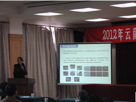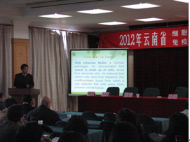 其次,会议进行了学术报告,由挂靠昆明动物所所的云南省免疫学会的理事长郑永唐研究员主持,分别由昆明动物研究所赵旭东研究员和云南大学黄晓伟副研究员作了“肿瘤干细胞学说的发展和应用”和“线虫病原细菌侵染宿主的分子机制研究”的精彩的学术报告。在场听众踊跃提问、热烈讨论,会场气氛十分活跃。整个会议期间,会员们还进行了广泛的个人交流,增进了相互之间的进一步了解和友谊。