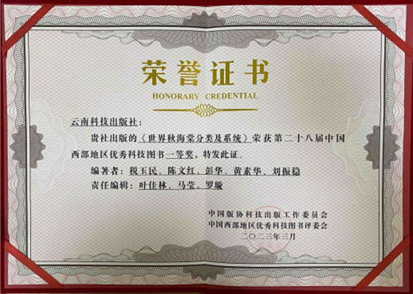 近日,中国科学院昆明植物研究所税玉民、陈文华、彭华、黄素华和刘振文所著的《世界秋海棠分类及系统》因其独具特色的排版格式,精致优美的植物图片,丰富详实的内容描述,获得了评委们的一致好评,荣获第二十八届中国西部地区优秀科技图书“一等奖”。