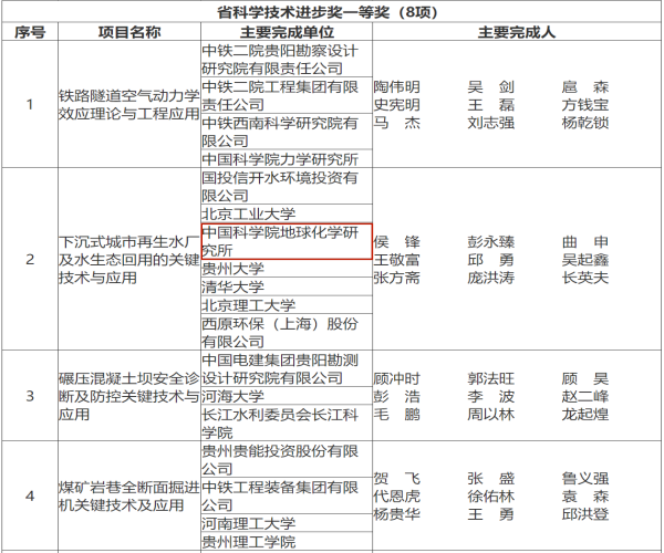 其中,地化所两项成果荣获2023年度贵州省科学技术奖。陈敬安团队的“湖泊生源要素生物地球化学循环与生态环境效应”成果(第一完成单位)获贵州省自然科学奖二等奖;王敬富团队的“下沉式城市再生水厂及水生态回用的关键技术与应用”成果(第三完成单位)获贵州省科学技术进步奖一等奖。