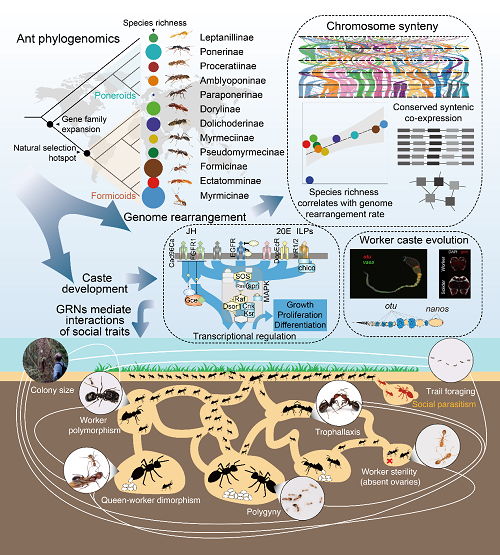 蚂蚁是演化上最成功的动物类群之一,其社会性是成功的关键。基于163种蚂蚁基因组与社会性状的比较研究,揭示了蚂蚁社会演化历史、物种分化机制及其遗传基础,解析了推动蚂蚁社会组织结构演化的关键机制。蚂蚁的社会演化,源于核心调控网络的重编程,也源于新基因对调控网络的再整合,而蚂蚁生态适应策略,更展现出高度的生存智慧。该研究为理解动物社会性演化提供了理论支撑,也为进一步生物资源挖掘及仿生应用提供了基础数据。