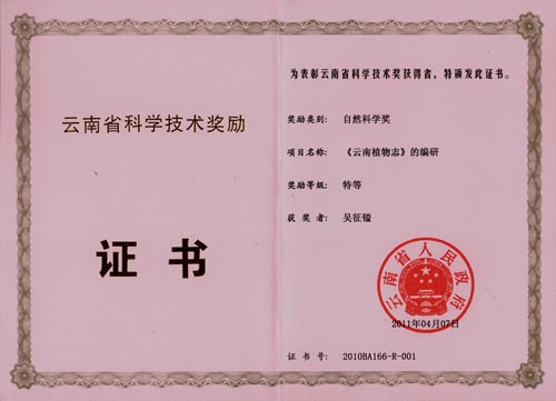 2010年云南省科学技术奖新增设特等奖奖种,由中国科学院昆明植物研究所吴征镒院士负责的“《云南植物志》的编研”荣获首项云南省自然科学奖特等奖。