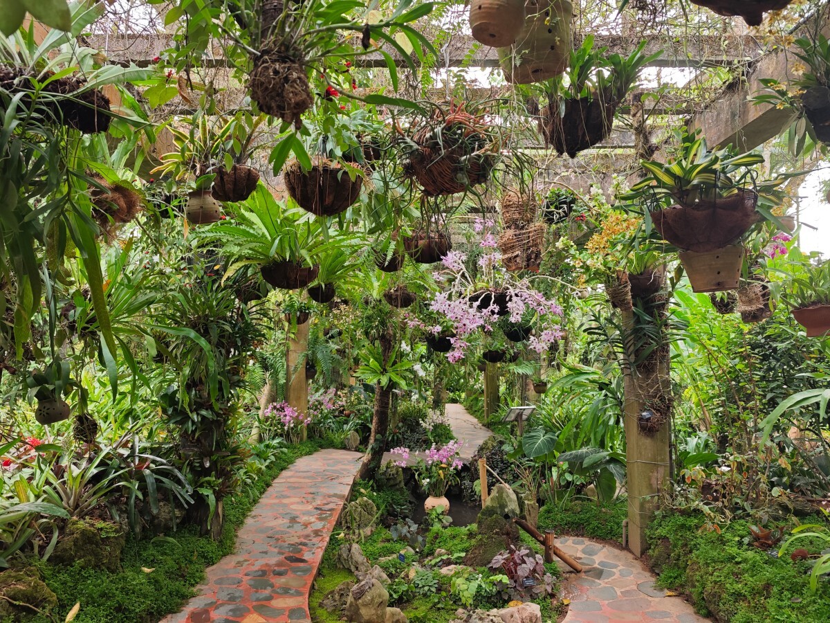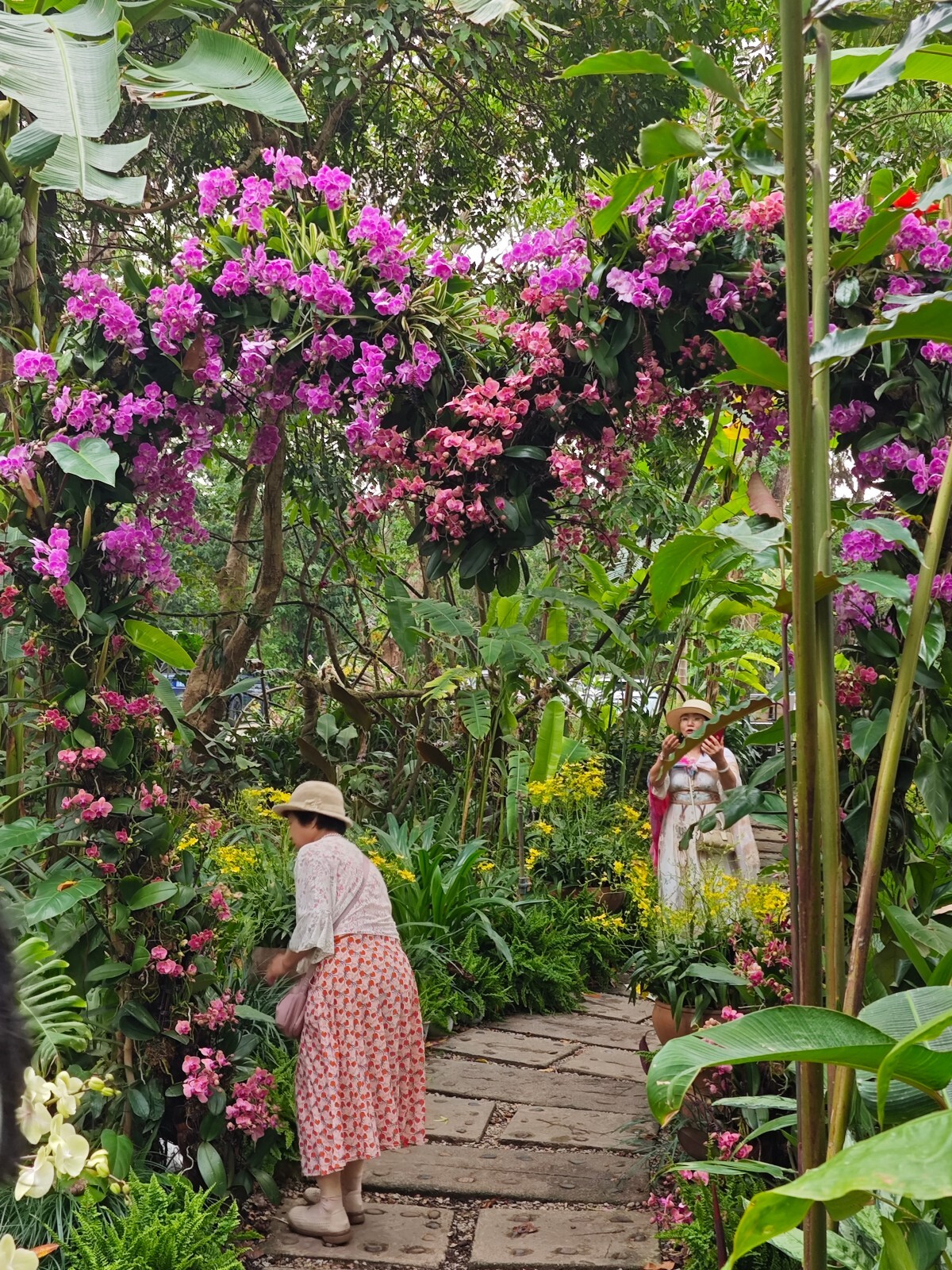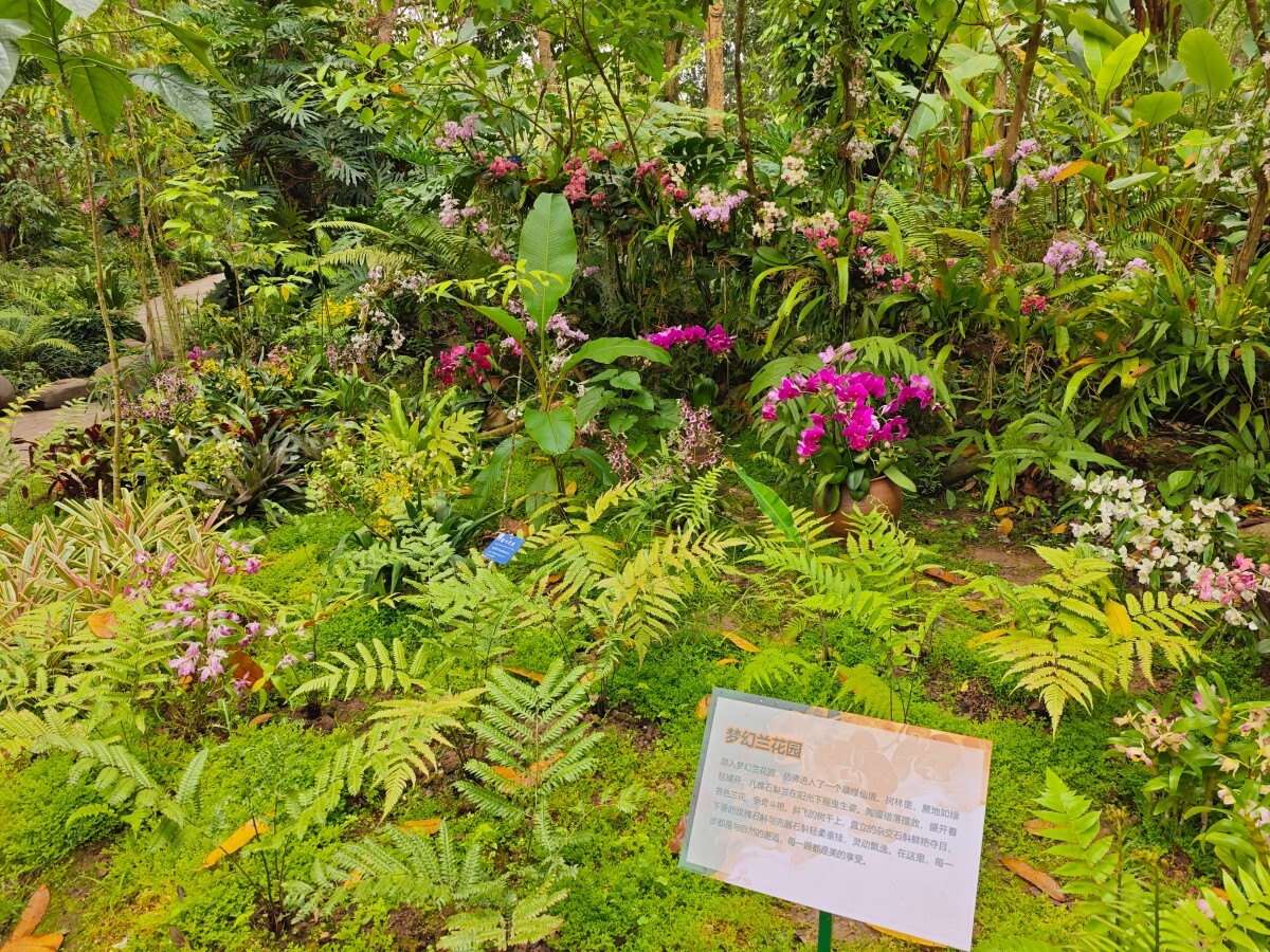 梦幻兰花园: 踏入梦幻兰花园,仿佛进入了一个翠绿仙境。树林里,蕨地如绿毯铺开,几株石斛兰在阳光下摇曳生姿。陶罐错落摆放,盛开着各色兰花,争奇斗艳。斜飞的树干上,直立的杂交石斛鲜艳夺目,下垂的玫瑰石斛与兜唇石斛轻柔垂挂,灵动飘逸。在这里,每一步都是与自然的邂逅,每一眼都是美的享受。