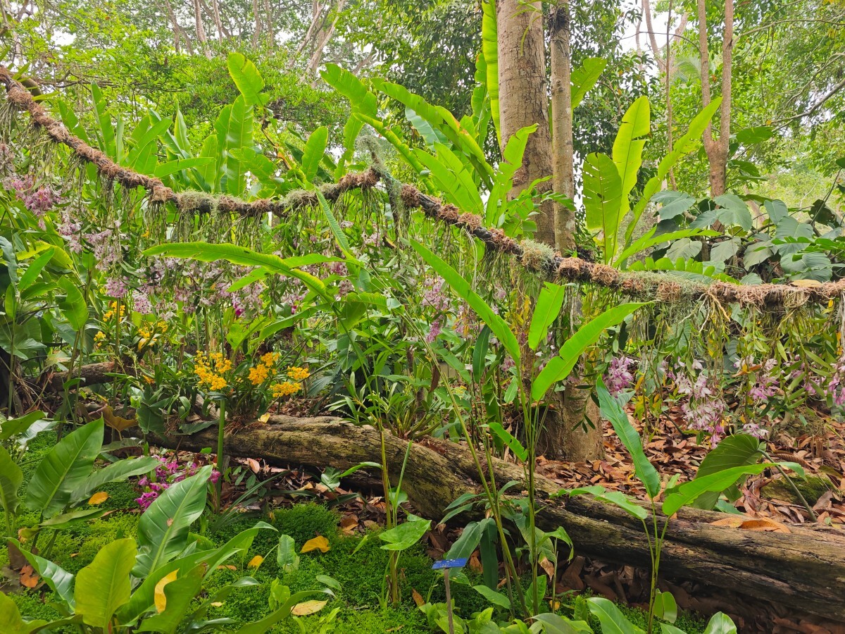 空中花园:以乔木为骨架、附生兰花为点缀、藤蔓植物为纽带,构建了“地面—树干—空中”三维立体空间结构,交织成流动的空中花海。热带兰花、鹿角蕨等附生植物自由攀附,还原雨林生态原貌,四季色彩更迭,生机盎然。竹木茅草屋散落绿海,取在地之材、承传统之工,民族智慧与现代空间隔空对话,一屋一景皆成诗。