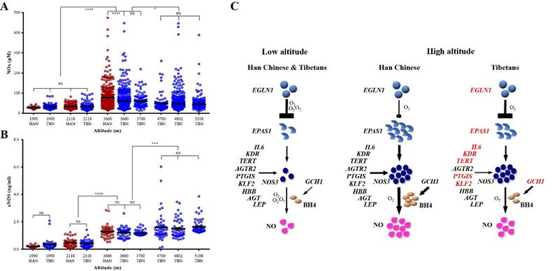 不同海拔藏族和汉族群体的血清NO水平(A)和eNOS(内皮型一氧化氮合酶)水平(B)比较;C,藏族NO钝化调节假说图解