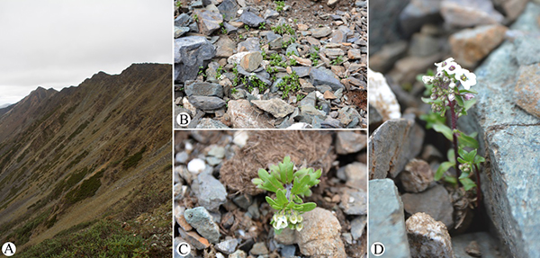 中国科学院昆明植物研究所高山植物多样性研究组博士研究生彭俊楚和陈洪梁于2018年7月前往哈巴雪山寻找中甸半脊荠。时值雨季,高山气候瞬息万变,风雨云雾交加,经过三天两夜,考查队员遍寻哈巴雪山东坡,却不见中甸半脊荠踪迹,由于恶劣的食宿条件,考查队员身体出现不适,只好提前下山,铩羽而归。2019年6月初,在第二次青藏高原综合科学考察(下文简称“二次科考”)的支持下,博士研究生钱栎屾和陈洪梁再次前往哈巴雪山找寻中甸半脊荠。在出发前,考查队员仔细研读了韩马迪所著采集日记,并保存了其当年所拍摄照片,基本确认了中甸半脊荠所在小地点。在到达哈巴雪山后,考查队员经过长时间徒步,翻过两个海拔4400米的垭口,在体力接近透支,濒临绝望之际,终于到达韩马迪所著日记记载的采集点附近,并在海拔4300米的哈巴雪山西坡发现疑似物种,经与模式标本和植物志描述比对,确认为中甸半脊荠无疑(见图版)。该物种生长在碎石陡坡,生长状况良好,居群数量可观,但由于地处高山牧场上方,随时可能会受到人为干扰,建议加强保护。中甸半脊荠所在的半脊荠属是横断山高山冰缘带特有属,对该属的深入研究有助于揭示冰缘带物种和生物多样性形成机制,该物种的重新发现为后续研究打下了坚实基础。