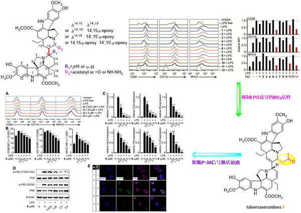 近期课题组成员郁阳博士从药用狗牙花(Tabernaemontana bovina)叶中获得了12个同一类型的二聚MIAs分子(图2),该类分子是由白坚木碱及其衍生物通过C-3和C-14′单键连接而成。对这类分子生物功能的挖掘研究,课题组采取与上海科技大学赵思蒙博士进行合作研究。进行了体外LPS诱导的小胶质BV2细胞活化的抑制活性筛选实验,发现了该类分子中tabernaemontines G具有很好的抑制BV2细胞活化活性,进一步机制研究表明tabernaemontines G分子是阻断了P-38信号激活通路来达到抑制BV2细胞活化的目的。该结果发现了MIAs具有抑制神经性炎症方面的生物功能,也是天然药物化学界少有的表达该类活性的分子。相关研究成果以“An Aspidosperma-type Alkaloid Dimer from Tabernaemontana bovina As a candidate for the Inhibition of Microglial Activation”为题发表在Organic Chemistry Frontiers (2020, 7, 1365)期刊上。