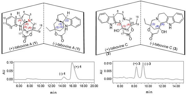 自然界中对映异构体是普遍存在的,尤其是在萜类化合物中。但MIAs其生源前体色氨和裂环马钱子苷为固定的构型,继而为通过该生源途径来确定MIAs骨架构型提供了重要参考。前人研究也发现个别生物碱存在对映异构体的现象,如(±)–voaphylline , (±)–eburnamine, and (±)–cleavamine (±)–coronaridine和 (±)–vincadifformine。但上述MIAs对映异构体均在不同植物乃至不同属种发现,是否存在共存的MIAs是该类生物碱中重要的科学问题之一。郁阳博士从药用狗牙花茎中同时发现了两对对映异构体(图3),进一步的生源推测认为该类对映体可能是由secodine前体通过一系列氧化断裂形成了关键的亚胺盐中间体,再通过亲核反应,继而形成了具有多个手性中心和多元环骈合的骨架。这种多手性中心的复杂生物碱的对映异构体在自然界较为罕见。值得一提的是,非等比例对映异构体的发现实属不易(图3),这对后续探索“纯”MIAs分子具有重要意义。研究成果以“Discovery of Natural Co-occurring Enantiomers of Monoterpenoid Indole Alkaloids”为题发表在Chinese Journal of Chemistry(2020, 38, 10.1002/cjoc.202000574.)期刊上。