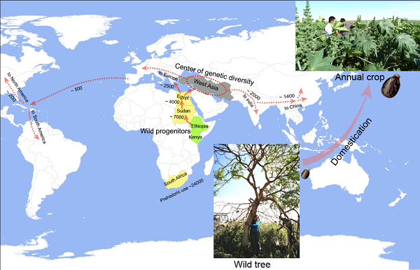 该研究揭示了蓖麻的栽培起源、居群分化、群体动态历史和驯化过程中重要农艺性状形成的分子基础,对理解蓖麻从多年生树到单年生油料作物驯化过程中的演化规律(图 1)和蓖麻的遗传育种具有重要的指导意义,而且拓宽了人类关于非粮作物的利用历史,以及人类活动影响非粮作物驯化的认识。