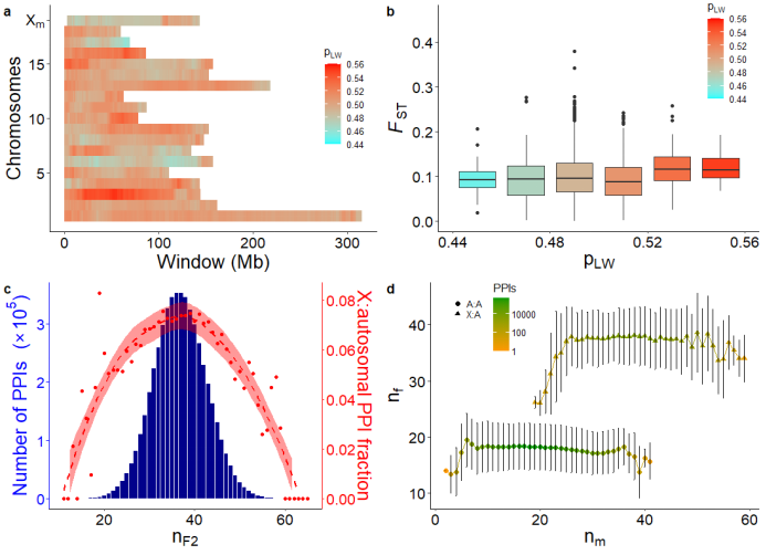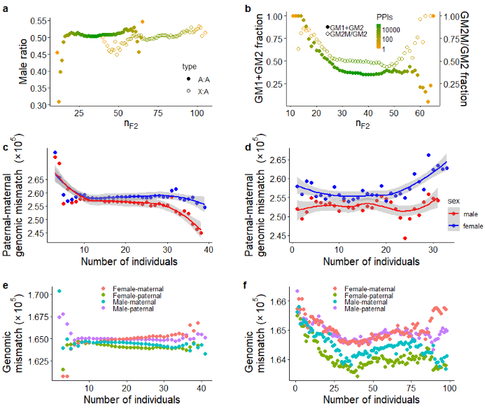 图2. 基因互作不兼容与杂种不存活以及不兼容基因互作的性别差异分布