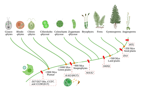 图3. 植物独脚金内酯与karrikin信号系统中相关基因起源的示意图