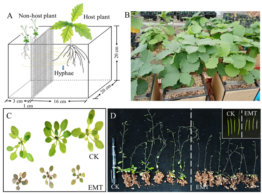 图1 宿主-EM-非宿主三方共培养体系以及非宿主拟南芥生长发育表型
