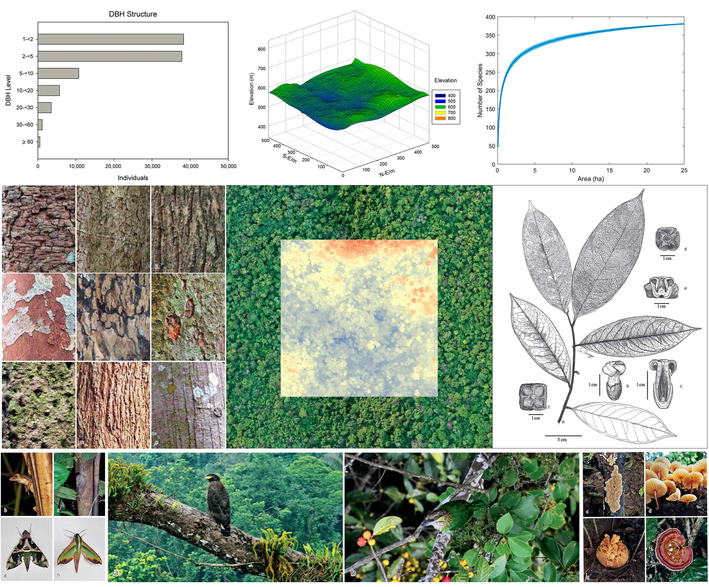 世界典型热带雨林动态大样地(25~50ha)配有实地形态特征齐全的“全景图”还没有报道过(https://forestgeo.si.edu/)。至今,仅在热带美洲亚马逊流域的厄瓜多尔Yasuni动态样地(50ha)专著收录约300种的实地树木形态图片数据,与整个动态样地记录的1150种差距甚远,而其他大洲的热带雨林动态样地目前出版的相关专著,都没有配有确凿的实地树种形态图片数据,并标注有一定数量的未知种,可见样地内观测树木的真实种类仍极具不确定性。而在世界的亚热带和温带地区,尤其在中国,就已出版了吉林长白山、陕西秦岭皇冠、湖南八大公山、云南玉龙雪山、台湾福山、台湾莲花池等6个25ha样地的专著,均配有完整实地树木形态照片数据的典型动态样地“全景图”。可见,热带雨林的调查和研究的难度之大。