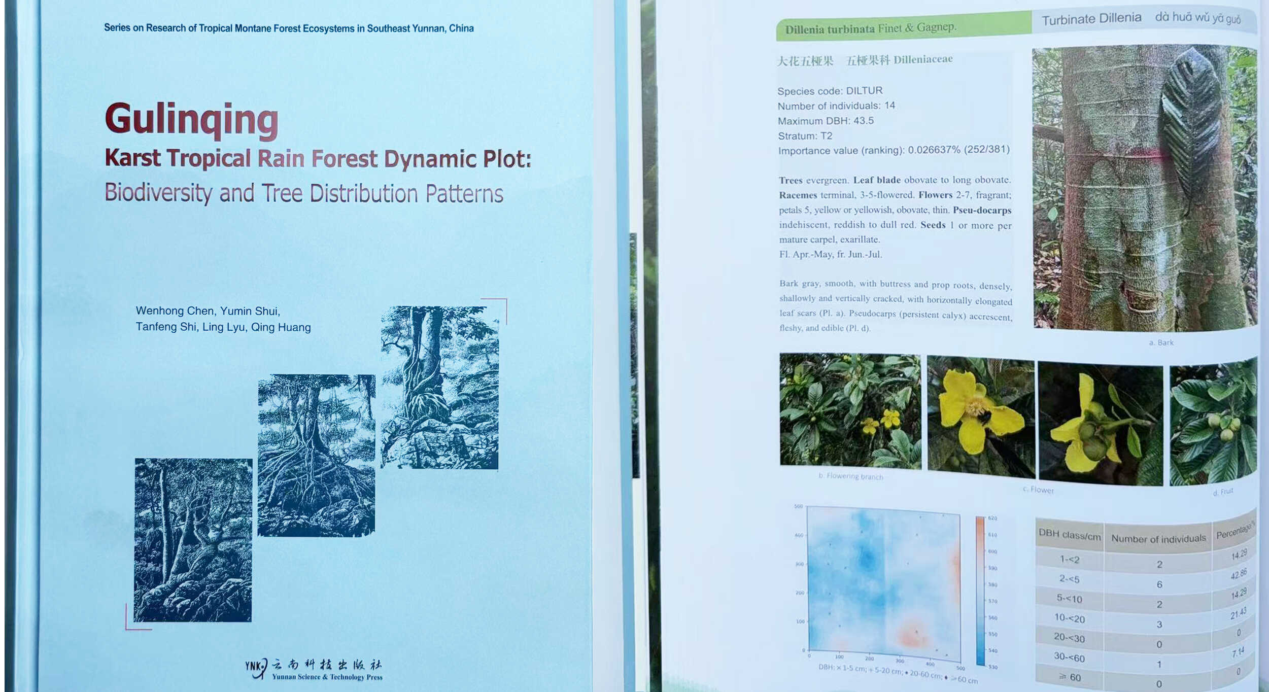 该成果近期以专著Gulinqing Karst Tropical Rain Forest Dynamic Plot: Biodiversity and Tree Distribution Patterns(云南科技出版社)形式面世(图2)。该书的亮点在于,1)将各种各样的岩石进行了初步的定义,为后期进行物种生态位的划定奠定基础;2)详细介绍了样地内的热带雨林特有或较多的几类生态现象,如板根、滴水叶尖、老茎生花、垂叶等;3)详细介绍了样地内各植物器官的多样性,如根(章鱼根,该书首次定义及介绍;气生根、呼吸根等)、茎(主要介绍了树皮的形态特征,并对其进行归类)、叶(复叶、单叶,叶面积大小,叶柄膨大等)、花及花序(花的种类,基本涵盖了各类花序类型)、果(聚合果、聚花果、核果、浆果、蒴果等)、种子等的形态多样性;4)几乎所有树种均配有树干表皮图片,并对树皮进行了初步分类;5)分析了样地内的物种组成,按重要值计优势种分别为番龙眼Pometia pinnata,苏门答腊柿Diospyros sumatrana,石山银钩花Mitrephora calcarea,瓜叶柏那参Brassaiopsis grushvitzkyi,望天树Parashorea chinensis,金丝李Garcinia fagraeoides,恰好分属不同的石、土生态位;6)简单介绍了样地及周边的动物(包括昆虫纲、两栖纲、爬行纲、鸟纲)和大型真菌部分常见或显眼的种类;7)样地内复叶种类达77种,且多为羽状复叶种类,这有待后续研究。