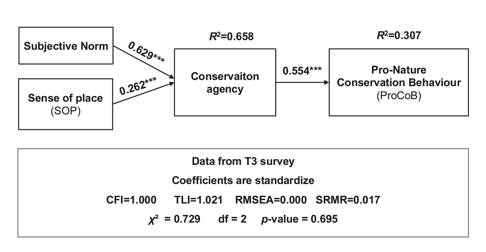图2:最终结构方程模型显示,地方感(SOP)通过保护能动性(Agency)对亲自然保护行为(ProCoB)产生影响。